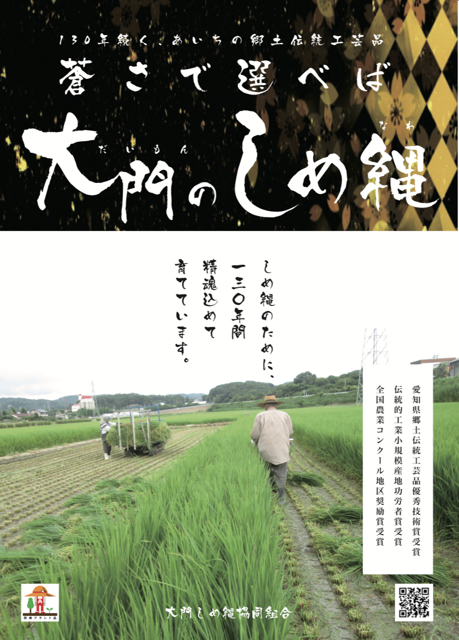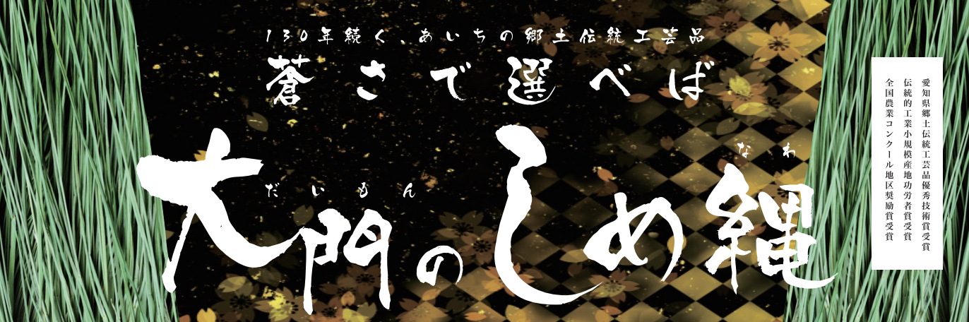 明治の中頃、現在の岡崎市大門の石川米吉氏が伊勢神宮へ参拝した折、しめ縄に感銘し技術を持ち帰ったのが始まりです。昭和12年ごろからしめ縄需要が増大し、副業としてのしめ縄作りが本格化しました。昭和25年に大門〆縄組合設立。