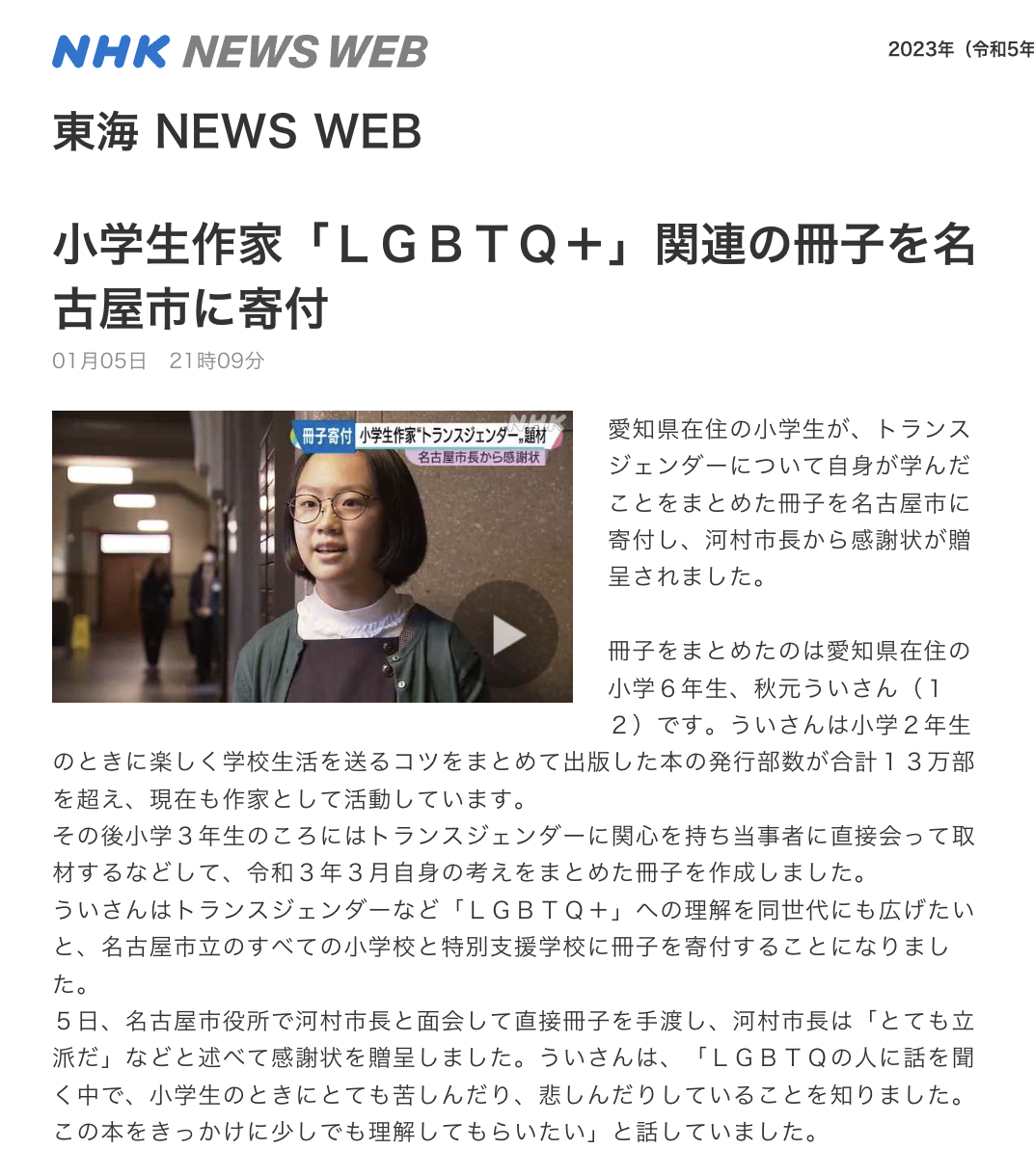 1月5日はういがトランスジェンダーの当事者さんにインタビューした冊子「小学生の私たちが知っているだけで、せかいをかえることができる」を、名古屋市の小学校、特別支援学校に寄贈しました。